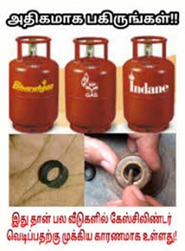 ‘கேஸ் சிலிண்டருக்கான புது இணைப்பைப் பெறும் போது, உங்கள் பகுதி டிஸ்ட்ரிப்யூட்டருக்கான அங்கீகரிக்கப்பட்ட மெக்கானிக்கை வரவழைத்து அவர் மூலமாக சிலிண்டரை இணைப்பது முக்கியம். ஒருவேளை அவர்கள் செய்ய மறுத்தால் ‘டெமோ’ செய்து காட்டும்படி கேட்கவேண்டும். முறையாக எப்படி இணைப்பது என்று கற்றுக் கொள்ள வேண்டும். சிலிண்டர் டெலிவரி ஆகும் போது, அதை அடுப்புடன் இணைத்து எரிய வைத்துப் பார்க்க வேண்டும். பிரச்னை ஒன்றும் இல்லை என்பதை உறுதி செய்துகொள்ள வேண்டும்.