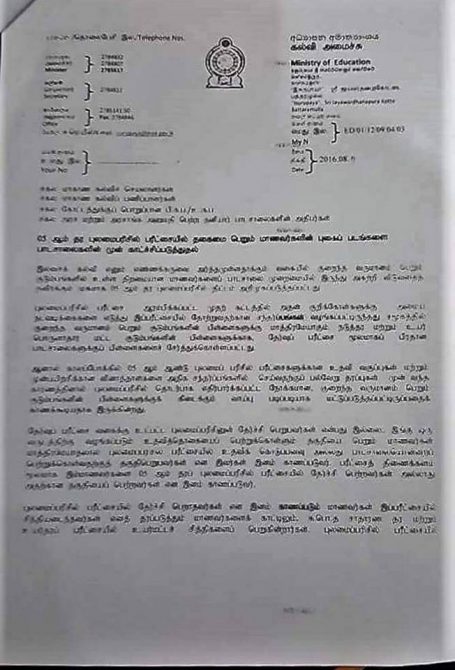 5ம் ஆண்டு புலமைபரீட்சையில் சித்தியடைந்த மாணவர்களின் புகைப்படங்களை பாடசாலைகளில் “பெனர் “ மூலமாக காட்சிப்படுத்தவேண்டாம் என கல்வி அமைச்சு அவசர சுற்றறிக்கையினை நேற்று (06/10/2016) வெளியிட்டுள்ளது. இதனால் சித்திபெறதவறிய மாணவர்களின் மனநிலை பாதிக்கும் எனவும் சுட்டிக்காட்டப்பட்டுள்ளது.