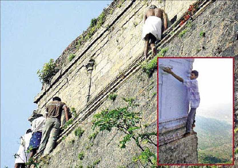 அவ்வாறு வரும் பக்தர்கள், மலை உச்சியில் உள்ள பெருமாள் கோயிலின் வெளிப்புறச் சுவரைப் பிடித்தபடி உள்ளங்கை அகலத்தில் உள்ள கட்டுமானத்தில் நடந்து சென்று கிரிவலம் சென்று வேண்டிக்கொள்வது வழக்கம். இக்கோயிலின் மேலே இருந்து கீழே பார்த்தாலே மயக்கம் வந்துவிடும் என்று பலரும் கூறுவர். எனினும் இந்தப் பகுதியை ஆண் மற்றும் பெண் பக்தர்கள் சுற்றிவருவது வழக்கம்.