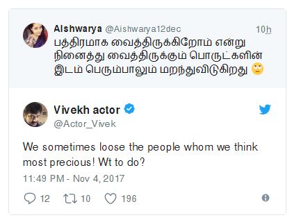 இது பற்றி இன்று ட்விட்டரில் பதிவிட்ட விவேக் “நாம் பொக்கிஷமாக நினைக்கும் ஒருவரை இழக்க நேரிடுகிறது. என்ன செய்ய முடியும்?” என சோகமாக பதிவிட்டுள்ளார்.