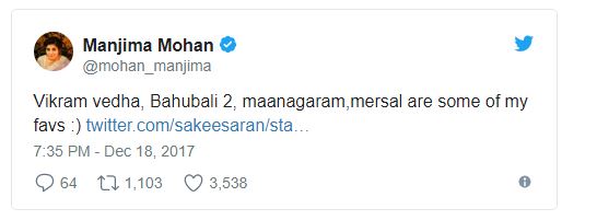 அது மட்டுமின்றி மஞ்சிமா தனக்கு மிகவும் பிடித்த படங்களில் மெர்சலும் ஒன்று என தெரிவித்துள்ளார்.
