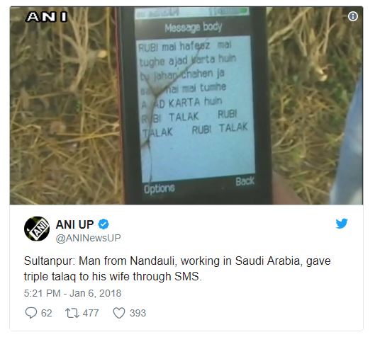உத்தரபிரதேசம் சுல்தான்பூரை சேர்ந்த ஒருவர் சவுதி அரேபியாவில் வேலை பார்த்து வருகிறார். இவர் தனது மனைவிக்கு எஸ்எம்எஸ் மூலம் தலாக் ( விவகாரத்து அனுப்பி உள்ளார்.