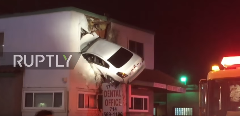 அமெரிக்காவில் கலிபோர்னியா சாண்ட்டா அனா பகுதி சாலை வழியாக அதிகாலையில் சுமார் 5.30 மணியளவில் வேகமாக வந்த ஒரு வெள்ளைநிற சொகுசு கார் ஓட்டுநர் கட்டுப்பாட்டை இழந்து சாலையின் குறுக்கே இருந்த தடுப்புச்சுவரை பயங்கரமாக மோதியது.