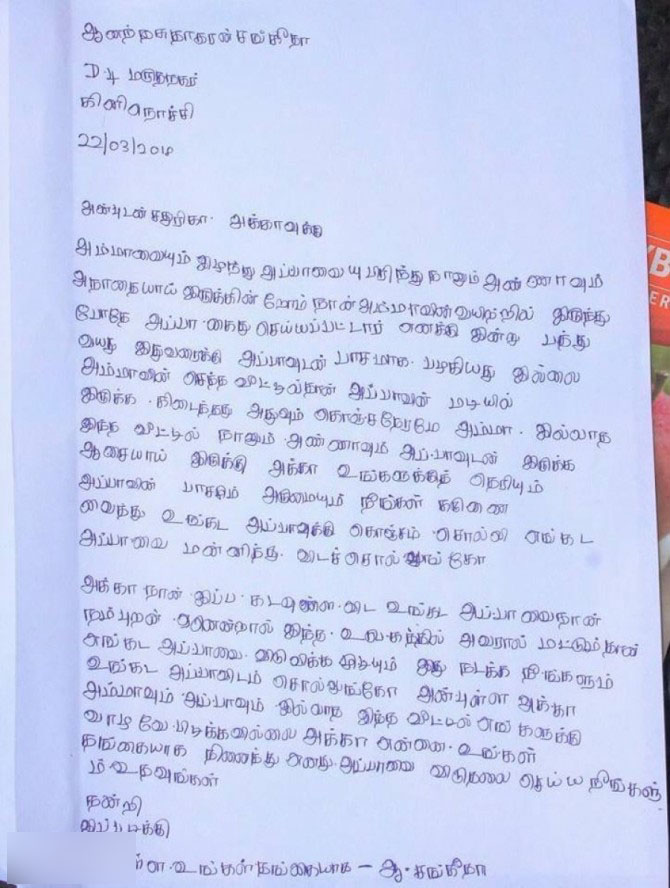அக்கா நான் இப்ப கடவுளை விட உங்கட அப்பாவைதான் நம்புறன் ஏனென்றால் இந்த உலகத்தில் அவரால் மட்டும்தான் எங்கட அப்பாவை விடுவிக்க முடியும். இது நடக்க நீங்களும் உங்கட அப்பாவிடம் சொல்லுங்கோ. அன்புள்ள அக்கா அம்மாவும் அப்பாவும் இல்லாத இந்த வீட்டில் எங்களுக்கு வாழவே பிடிக்கவில்லை.
