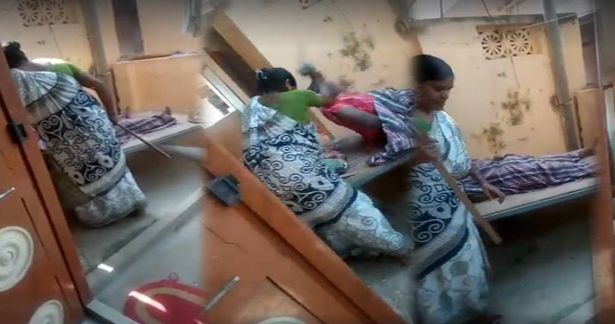 படுகையில் இருக்கும் வயோதிப பெண் மீது உதவி நிறுத்தப்பட்ட பெண் கடுமையாக தாக்கியுள்ளார்.