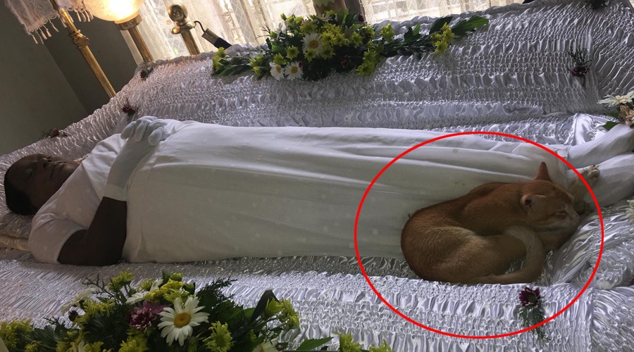 தனது எஜமானியின் மரணத்தை தாங்கிக் கொள்ள முடியாத பூனை, உடலத்தின் கால்கள் மீது படுத்திருந்த நெகிழ்ச்சியான சம்பவம் ஒன்று இடம்பெற்றுள்ளது.