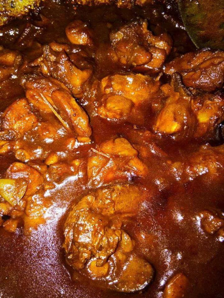 5. வேகவைத்துள்ள அரை வேக்காடு நாட்டுக்கோழியை வடச்சட்டியில் சேர்த்து நன்கு வதக்கவும். இத்துடன் உப்பு தூள் சேர்த்து வதக்கவும். அதனுடன் நாட்டுக்கோழி சாறை பிரஷர் குக்கரில் இருந்து ஊற்றவும். நன்கு கொதிக்க வைத்து நாட்டுக்கோழி வெந்துள்ளதா என்று சரி பார்த்து கொள்ளவும்.
