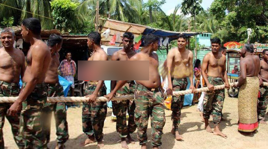 இதன்போது ஆலயத்திற்கு வருகைத்தந்திருந்த 100க்கும் மேற்பட்ட இராணுவத்தினர், தமது சீருடையின் மேலங்கியை கழட்டி விட்டு தேர் வடம் பிடித்து தேர் இழுத்தனர்.