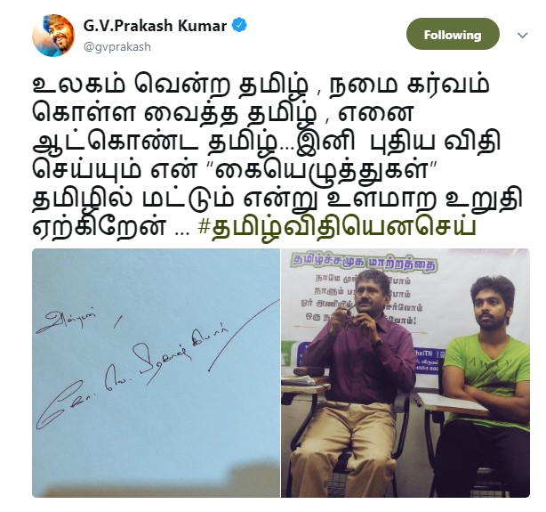 இது தொடர்பாக அவர் தனது டிவிட்டர் பக்கத்தில் “ உலகம் வென்ற தமிழ் , நமை கர்வம் கொள்ள வைத்த தமிழ், எனை ஆட்கொண்ட தமிழ்…இனி புதிய விதி செய்யும் என் “கையெழுத்துகள்” தமிழில் மட்டும் என்று உளமாற உறுதி ஏற்கிறேன் … #தமிழ்விதியெனசெய்” என பதிவிட்டுள்ளார்.