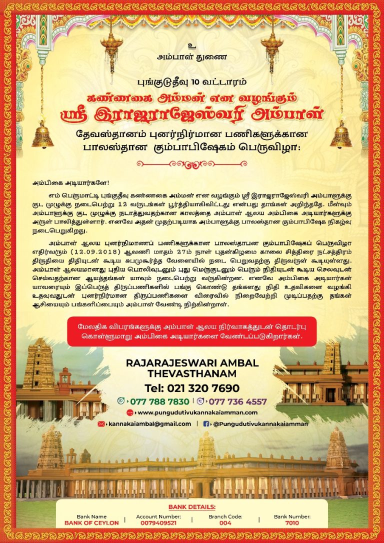 அம்பாள் ஆலய புனர்நிர்மான பணிகளுக்கான பாலஸ்தாபன கும்பாபிஷேகப் பெருவிழா எதிர்வரும் (12.09.2018) ஆவணி மாதம் 27ம் நாள் புதன்கிழமை காலை சித்திரை நட்சத்திரம் திருதியை திதியுடன் கூடிய சுபமுகூர்த்த வேளையில் நடை பெறுவதற்கு திருவருள் கூடியுள்ளது. அம்பாள் ஆலயமானது புதிய பொலிவுடனும் புது மெருகுடனும் பெரும் நிதியுடன் கூடிய செலவுடன் செய்வதற்கான ஆயத்தங்கள் யாவும் நடைபெற்று வருகின்றன. எனவே அம்பிகை அடியார்கள் யாவரையும் இப்பெருத் திருப்பணிகளில் பங்கு கொண்டு தங்களது நிதி உதவிகளை வழங்கி உதவுவதுடன் புனர்நிர்மான திருப்பணிகளை விரைவில் நிறைவேற்றி முடிப்பதற்கு தங்கள் ஆசியையும் பங்களிப்பையும் அம்பாள் வேண்டி நிற்கின்றாள்.