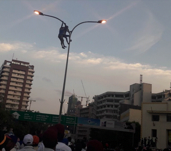 கொழும்பு கோட்டை லேக் ஹவுஸ் சுற்றுவட்டத்திலுள்ள மின்சார தூணில் ஏறி ஆபத்தான முறையில் செயற்பட்டுள்ளனர்.