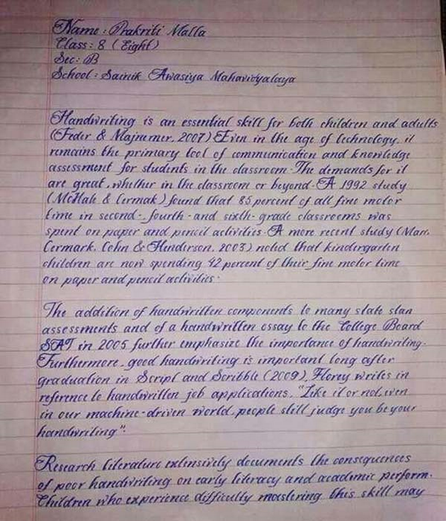 இவரின் கையெழுத்தானது கணிப்பொறியில் இருந்து அச்சு எடுக்கப்பட்டது போலவே இருக்கிறது. இவர் 9-ம் வகுப்பு படித்து வருகிறார்.