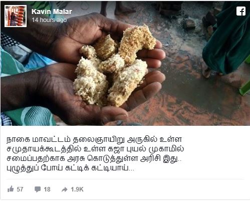“ஊருக்கே சோறுபோட்ட சோழ வளநாடு”, என போற்றப்பட்ட தமிழ்நாடு டெல்டா மாவட்டங்களுக்கு இது போன்ற நிலைமையா? என்கிற எண்ணம்தான் அனைவருக்கும் தோன்றுகிறது. இந்த நிவாரண முகாம்களுக்கு வழங்கப்பட்ட அரிசியை, சமூக வலைத்தளங்களில் அரசின் மீது கடும் விமர்சனங்களை பதிவிட்டு வருகின்றனர்.