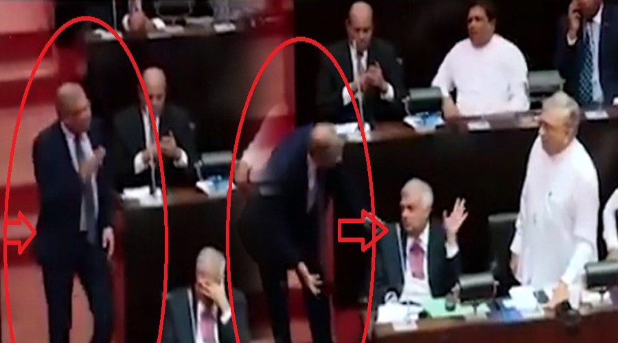 இதேவேளை, இவர் எழுந்து வந்து பேசும் போது ஐக்கிய தேசியக் கட்சியின் தலைவரான ரணில் மனைவியை இழந்து கவலையில் இருப்பது போல தடுமாற்றத்தில் கண்ணத்தில் வைத்த படி பேசுகின்றார்.