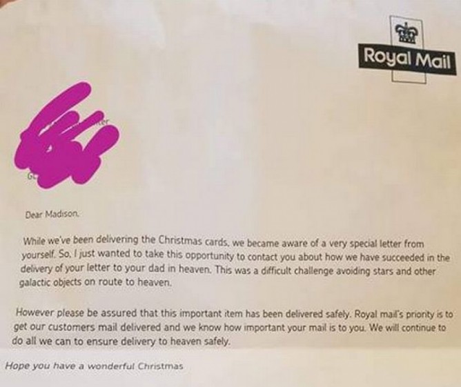 சிறுமி மேடிசனின் மன ஆறுதலுக்காக தங்கள் கடமையை மீறி இவ்வாறு செய்தோம் என தபால் நிறுவனம் விளக்கமளித்துள்ளது.