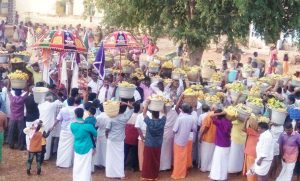 பின்னர், தங்களின் கோரிக்கையை நிறைவேற்றும் பெருமாளுக்கு நன்றி செலுத்தும் விதமாக அந்த பழங்களை, மேளதாளம் முழங்க கிராமத்தின் முக்கிய வீதிகளின் வழியாக ஊர்வலமாக எடுத்துச் சென்று, ஊரின் எல்லை தெய்வமான ரெங்கம்மாள் கோயிலில் வைத்து வழிபாடு நடத்தினர். இதையடுத்து அந்த பழங்களை கூடை மற்றும் பெரிய பாத்திரங்களில் நிரப்பி, 300 ஆண்டு பழைமையான சோலைமலை அழகர் பெருமாள் கோயிலுக்கு கொண்டுவந்து, அங்கு சிறப்பு பூஜைகள் நடத்தினர்.
