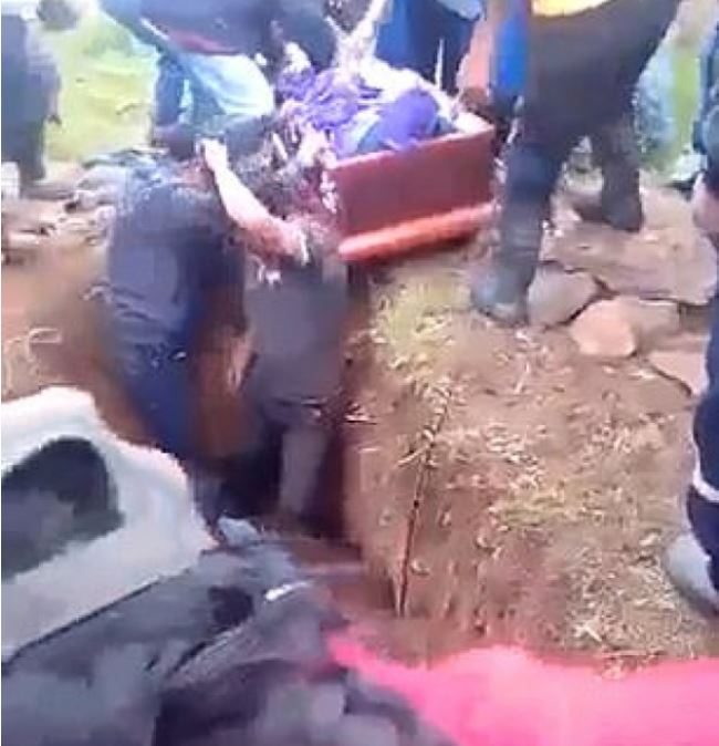வெளியான வீடியோ ஒன்றில், பெருவில் நடைபெற்ற ஒரு முதிய பெண்மணியின் இறுதிச் சடங்கின்போது பெட்டியை குழிக்குள் இறக்கும் நடவடிக்கையில் நான்கு பேர் ஈடுபட்டிருக்கின்றனர்.