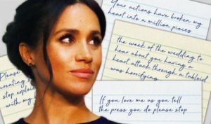 என்னை நேசிக்கிறேன் என்று பேட்டிகளில் சொல்கிறீர்கள், அது உண்மையென்றால் தயவு செய்து எங்களை நிம்மதியாக வாழ விடுங்கள், பொய் சொல்வதை நிறுத்துங்கள், எங்களுக்கு வேதனை ஏற்படுத்துவதை நிறுத்துங்கள், என் கனவனுடனான உறவை கொச்சைப்படுத்துவதை நிறுத்துங்கள் என கண்ணீருடன் அந்த கடிதத்தை எழுதியுள்ளார் மேகன்.