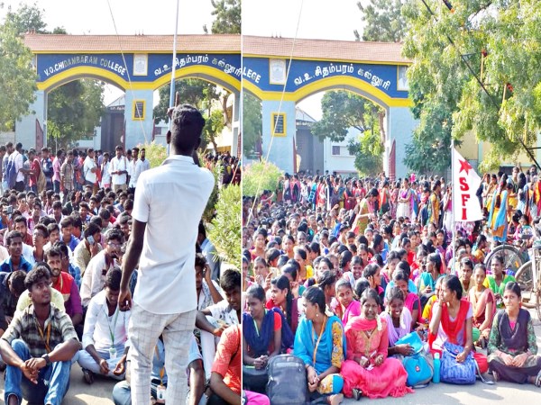 பொள்ளாச்சி பாலியல் வன்முறை சம்பவத்தில் குற்றவாளிகளை தூக்கிலிட வலியுறுத்தி தூத்துக்குடி வஉசி கல்லூரி மாணவ, மாணவியர்கள் போராட்டம் நடத்தினர்.