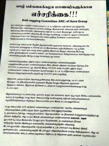 யாழ். பல்கலைக்கழக மாணவர்களுக்கு ஓர் எச்சரிக்கை என தலைப்பிடப்பட்ட ஆவா குழுவினரின் பகிரங்க துண்டு பிரசுரங்கள் விநியோகிக்கப்பட்டுள்ளன.