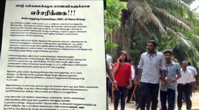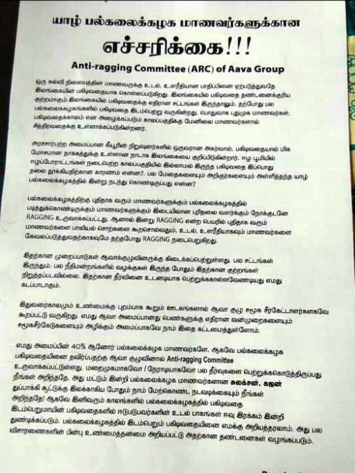 பகிடிவதைக்கு எதிராக குறித்த துண்டு பிரசுரங்கள் பிரசுரிக்கப்பட்டுள்ளன.