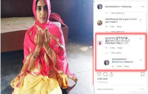 இன்று அவர் தொழுகை நடத்தும் ஒரு புகைப்படத்தை பதிவிட்டுள்ளார். அதை பார்த்த ரசிகர் ஒருவர் “உங்கள் இஸ்லாமிய பெயர் என்ன?” என கேட்க, “தபஸ்ஸும்” என கஸ்தூரி பதில் அளித்துள்ளார்.