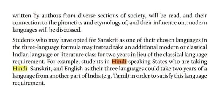 எனவே ஹிந்தி மொழி பேசாத மாநிலங்களில் ஹிந்தியை மூன்றாவது மொழியாகவும், அதே போல ஹிந்தி பேசும் மாநிலங்களில் தமிழ் போன்ற மாநில மொழிகளை மூன்றாவது மொழியாக சேர்க்கலாம் என்பதுதான் புதிய கல்விக் கொள்கையின் வரைவு அறிக்கையின் சாராம்சம்.