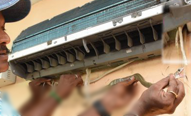 இதனால் அதிர்ச்சி அடைந்த பழுதுபார்த்தவர், ஏ.சி.யின் கீழ் பகுதியில் ஒளி அடித்து பார்த்துள்ளார். அங்கு, மறைவான பகுதியில் ஒரு பாம்பு ஒளிந்திருப்பது தெரிய வந்தது. இதனையடுத்து, வனத்துறைக்கு தகவல் தெரிவிக்கப்பட்டது. வனத்துறையின் பாம்பு பிடிக்கும் ஊழியர்கள் 2 பேர் வந்து, ஏ.சி.க்குள் மறைந்திருந்த பாம்பை பிடிக்க முயன்றனர்.