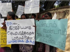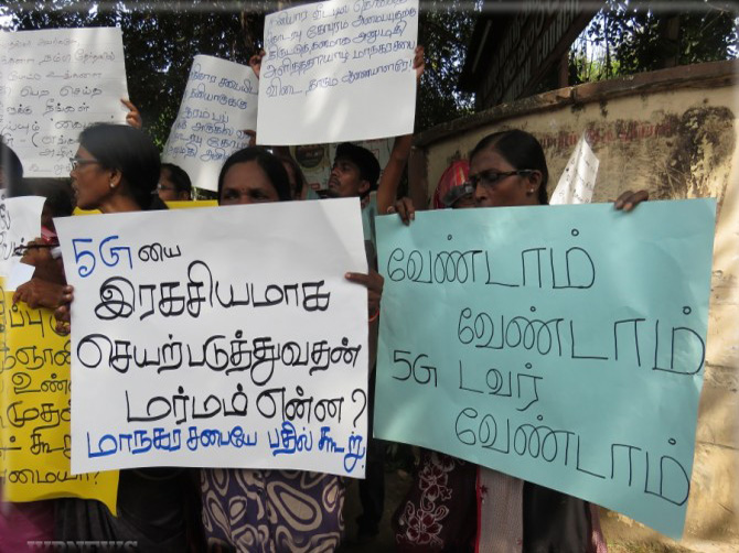 இதன்போது அறிவியல் எனக் கூறி ஆபத்தை விதைக்காதே, 5G இரகசியமாக செயற்படுத்துவதன் மர்மம் என்ன?, வேண்டாம் வேண்டாம் 5G டவர் வேண்டாம் போன்ற வாசகங்கள் எழுதிய பதாதைகளை மக்கள் ஏந்தியிருந்தனர்.