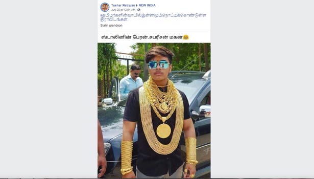 வழக்கத்தை விட அதிகளவு தங்க நகைக்கள் அணிந்திருக்கும் நபர் முக ஸ்டாலின் பேரன் என அந்த பதிவில் கூறப்பட்டுள்ளது.