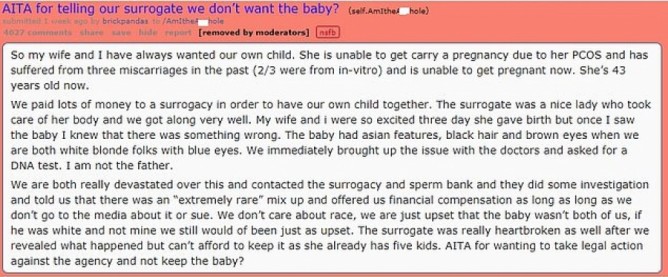 எங்களுக்கு அது ஆசியக் குழந்தை என்பதில் பிரச்சினை இல்லை என்று கூறும் அவர், அது எங்கள் இருவரின் குழந்தையுமே இல்லை என்பதுதான் பிரச்சினை என்கிறார்.