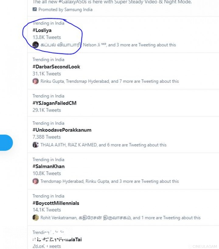 அதை தொடர்ந்து டுவிட்டரில் இந்தியளவில் லொஸ்லியா ட்ரெண்டிங்கில் முதலிடத்திற்கு வந்தார்.