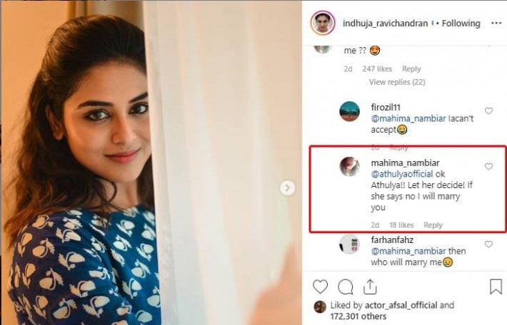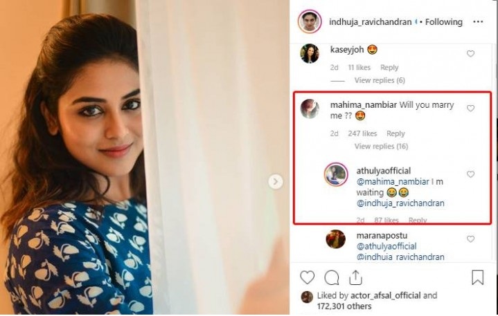 இவர் தற்போது இன்ஸ்டாக்ராமில் சில புகைப்படங்களை வெளியிட்டுள்ளார். அதை பார்த்துவிட்டு நடிகை மஹிமா நம்பியார் ‘திருமணம் செய்துகொள்ளலாமா?’ என ப்ரொபோஸ் செய்துள்ளார். அவரும் அவருக்கு ஓகே சொல்லிவிட, நடிகை அதுல்யா ‘ஐ எம் வெயிட்டிங்’ என்று பதிவிட்டுள்ளார்.