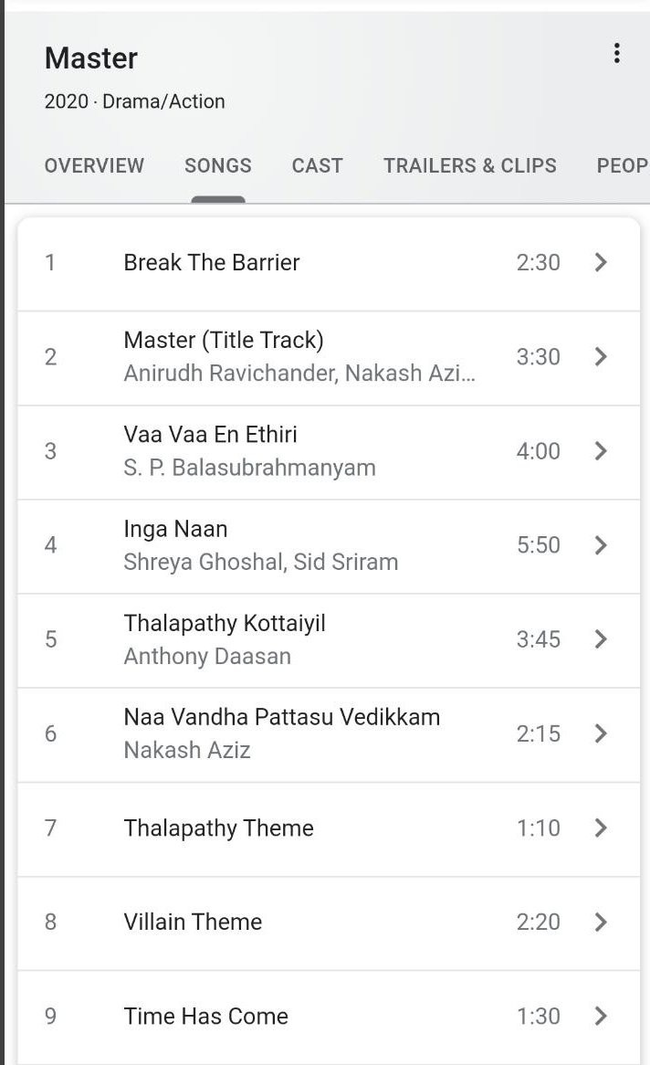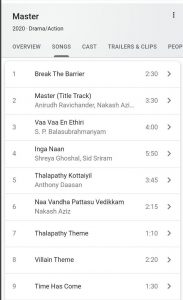 இது குறித்த டேக் டிவிட்டரில் #MasterThirdLook 1 மில்லியன் ட்வீட்ஸ் செய்யப்பட்டு ரசிகர்களால் சாதனை செய்யப்பட்டுள்ளது.மேலும் தற்போது இப்படத்தில் டிராக் லிஸ்ட் குறித்த தகவல்கள் வெளியாகியுள்ளது.