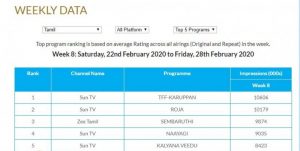 அதே நேரத்தில் முதலிடத்தில் கடந்த வாரம் ஒளிப்பரப்பாகிய கருப்பன் படம் இருப்பது குறிப்பிடத்தக்கது.