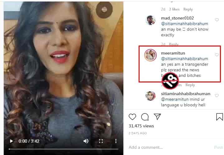 இந்நிலையில் தனது இன்ஸ்டாகிராம் பக்கத்தில் தமிழக அரசைப் பாராட்டி மீராமிதுன் ஒரு வீடியோவை பதிவு செய்தார். அதைக் கண்ட நெட்டிசன் ஒருவர், நீ பார்ப்பதற்கு திருநங்கை போலவே இருக்கிறாய். உண்மையை சொல்லு என கேள்வி கேட்டார். இதை கண்டு கோபமடைந்த மீராமிதுன், நான் திருநங்கை தான். அதை நான் ஏற்கனவே ஒப்புக் கொண்டேன். இது எல்லாருக்கும் பரப்புடா** என கெட்டவார்த்தையால் திட்டி உள்ளார்.