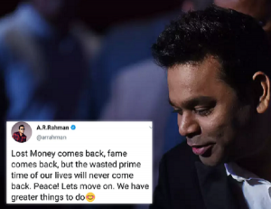 இழந்த பணத்தையும், புகழையும் திரும்பப் பெற்றுவிடாலம் ஆனால் நேரத்தை திரும்பப் பெற முடியாது என இசையமைப்பாளர் ஏ.ஆர்.ரஹ்மான் ட்விட்டரில் பதிவிட்டுள்ளார். மேலும், அமைதியாக கடந்து செல்வோம் என்றும், ஆற்ற வேண்டிய பெரும் பணிகள் உள்ளது எனவும் அவர் பதிவிட்டுள்ளார். ஹிந்தி திரைப்பட வாய்ப்புகளை ஒரு கும்பல் பறிப்பதாக இசையமைப்பாளர் ஏ.ஆர்.ரகுமான் தெரிவித்த நிலையில், அவரது கருத்துக்கு பலரும் ஆதரவு தெரிவித்து வருகின்றனர்.