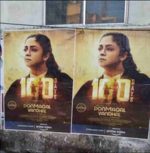 தமிழில் ஜோதிகா நடித்துள்ள ‘பொன்மகள் வந்தாள்’ அமேசானில் வெளியாகி 100 நாட்களை தொட்டுள்ளது. இதை கொண்டாடும் வகையில் அமேசானே தெருவுக்கு தெரு 100 நாள் போஸ்டர் ஒட்டி உள்ளார்கள்.