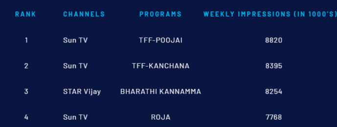 ஆம் 8254 பார்வையாளர் கொண்டு 3ஆம் இடத்தை பாரதி கண்ணம்மா சீரியலும், 7768 பார்வையாளர்கள் கொண்டு 4ஆம் இடத்தை ரோஜா சீரியலும் பிடித்துள்ளது.