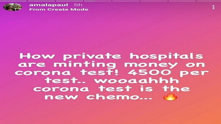 நடிகை அமலா பால் சமூகவலைதளத்தில் ‘ஒரு கொரோனா சோதனைக்கு தனியார் மருத்துவமனைகள் 4500 ரூபாய் வசூலிக்கிறார்கள். கொரோனா சோதனைதான் புதிய கீமோதெரபி (புற்றுநோயாளிகளுக்கு செய்யப்படும் சிகிச்சை)’ எனத் தெரிவித்துள்ளார்.