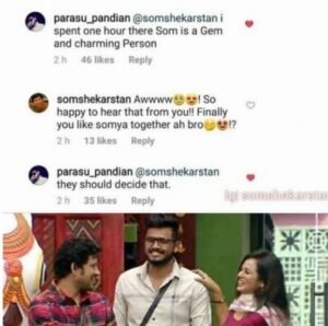 இந்நிலையில் ரம்யா பாண்டியனின் தம்பியிடம் ரசிகர் ஒருவர், ” சோம் சேகர் மற்றும் ரம்யா பாண்டியன் இருவரும் ஒன்றாக இணைவார்களா ” என்று கேட்டுள்ளார்.