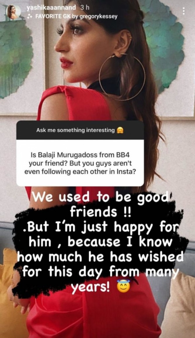 இந்நிலையில், யாஷிகா ஆனந்த், தனது இன்ஸ்டாகிராம் பக்கத்தில் லைவ் சாட்டில் இருக்கும் போது ரசிகர் ஒரு ‘பாலாஜி முருகதாஸ் உங்கள் நண்பரா ? ஆனால், முருகதாஸ் நீங்கள் இன்ஸ்டாகிராமில் ஒருவரை ஒருவர் பின் தொடரவில்லை’ என்று கேள்வியை கேட்டிருந்தார். அதற்கு பதில் அளித்த யாஷிகா’நாங்கள் இருவரும் நல்ல நண்பர்களாக தான் இருந்தோம்.