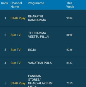 முதல் இடத்தை பாரதி கண்ணம்மா சீரியல் பிடித்துள்ளது, அடுத்து ரோஜா, வானத்தைப் போல, பாண்டியன் ஸ்டோர்ஸ் சீரியல்கள் இடம் பிடித்துள்ளன.