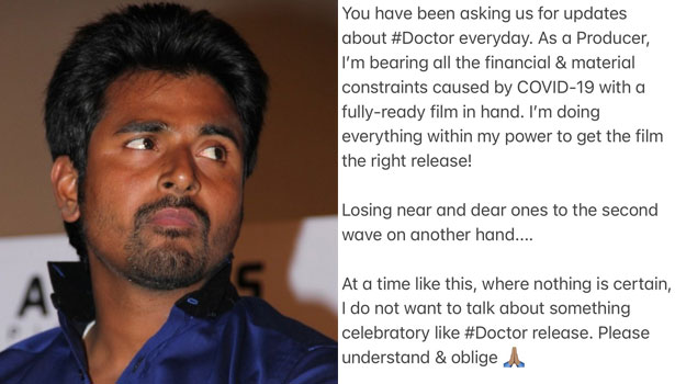 மறுபக்கம், கொரோனா இரண்டாவது அலையில் சுற்றங்களையும், நண்பர்களையும் இழந்து கொண்டிருக்கிறேன். இதுபோன்ற ஒரு சூழ்நிலையில் டாக்டர் படத்தின் ரிலீஸ் குறித்து நான் எதுவும் பேச விரும்பவில்லை. கொரோனா விதிமுறைகளை பின்பற்றி அனைவரும் வீட்டில் பாதுகாப்பாக இருங்கள்” என தெரிவிக்கப்பட்டுள்ளது.