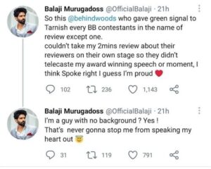 விஜய் தொலைக்காட்சியில் ஒளிபரப்பான பிக் பாஸ் சீசன் 4 நிகழ்ச்சியின் மூலமாக பிரபலமானவர் தான் பாலாஜி முருகதாஸ். இவர் இதற்கு முன்பாக குறும்படங்கள் மற்றும் ஆல்பம் பாடல்களில் நடித்து இருக்கின்றார். பிக்பாஸ் வீட்டில் இவருக்கு மிகப்பெரிய எதிர்ப்பு இருந்தாலும் கூட தற்போது வரை கெத்தாக வலம் வருகிறார்.