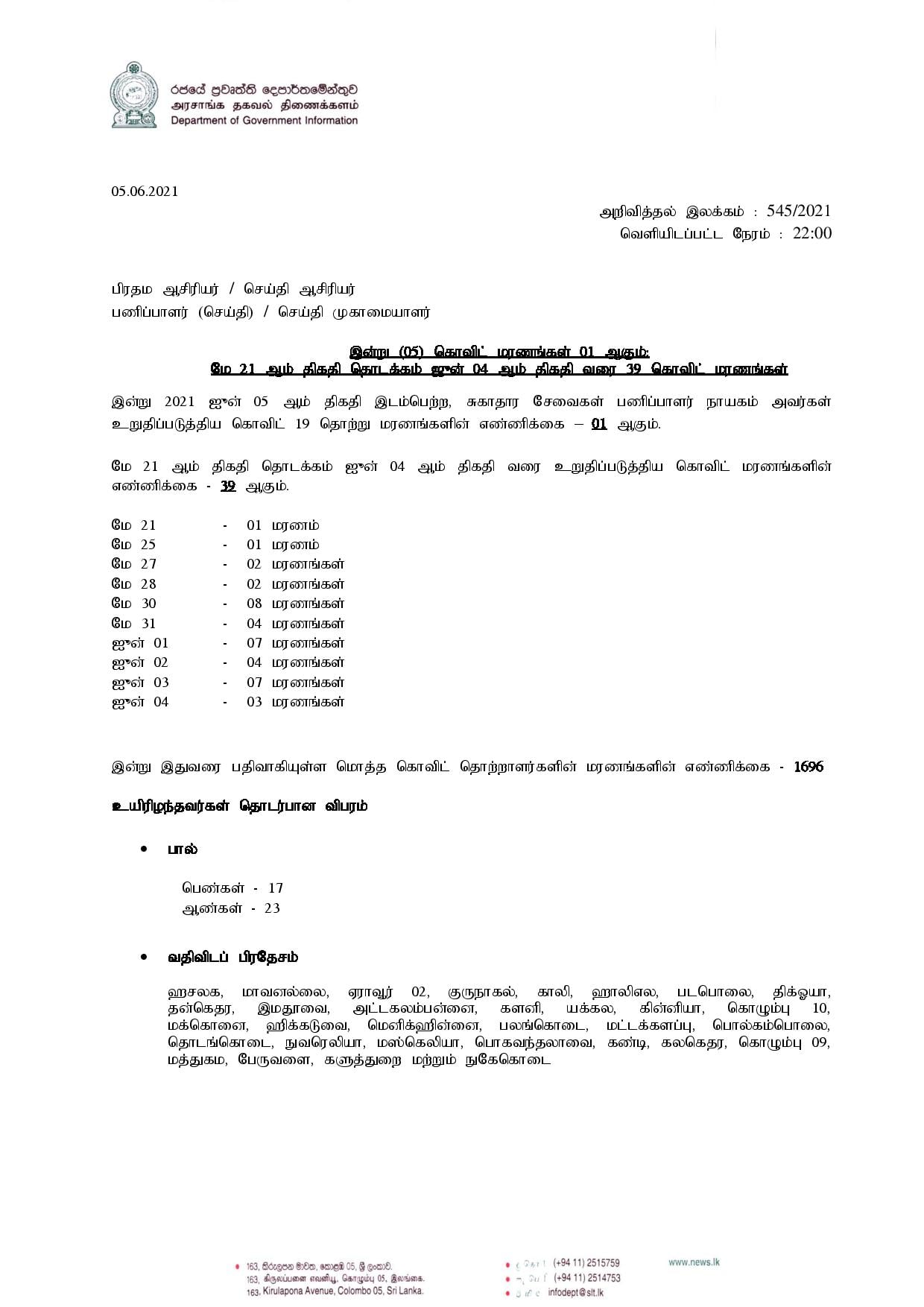 அதன்படி, நாட்டில் கொரோனா தொற்றுக்கு உள்ளாகி உயிரிழந்தோரின் எண்ணிக்கை 1,696 ஆக அதிகரித்துள்ளது.