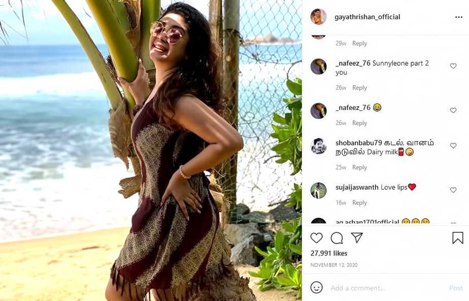சமூக வலைத்தளங்களில் பிஸியாக இருக்கும் காயத்ரி அடிக்கடி புகைப்படங்களை வெளியிட்டு ரசிகர்களை கைக்குள் வைத்திருக்கிறார். இவரது புகைப்படங்களுக்கும் வீடியோக்களுக்கும் லைக்குகள் குவிந்து வருகின்றன. தற்போது கடற்கரையில் நின்று கவர்ச்சி படங்களை வெளியிட்டுள்ளார். அவரது புகைப்படத்தை பார்த்த ரசிகர்கள், கடற்கரையில் பர்மா தேக்கு என கமெண்ட் அடித்து வருகின்றனர்.