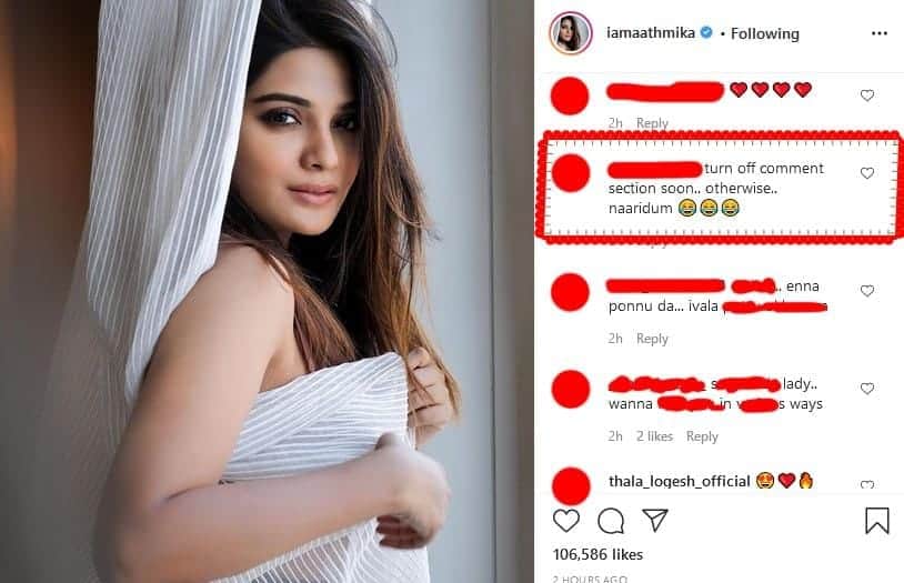 வைபவ், வரலட்சுமியுடன் காட்டேரி, உதயநிதியுடன் கண்ணை நம்பாதே, விஜய் ஆண்டனியுடன் ஒரு படம் என தற்போது நடித்து வருகிறார். இந்நிலையில், பட வாய்ப்புக்காக அவ்வப்போது கவர்ச்சி புகைப்படங்களை, வீடியோக்களை வெளியிட்டு வரும் ஆத்மிகா, அம்மணியின் லேட்டஸ்ட் புகைப்படங்களை வர்ணித்து வருகிறார்கள். இதிலும், சிலர் “Comment Section-ஐ Off பண்ணிடுங்க, இல்லனா அவ்வளவுதான்” என்று கலாய்த்தும் வருகிறார்கள்.