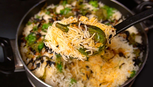 இப்போது இதில் அரை வேக்காடாக வேக வைத்த சாதத்தை சேர்த்து நன்றாக கிளறி, அதில் பாதியை எடுத்து ஒரு பாத்திரத்தில் வைத்துக் கொண்டு, பாத்திரத்தில் உள்ள கலவையில் கத்திரிக்காயை பரப்பி, எடுத்து வைத்துள்ள சாதத்தை அதன்மேல் பரப்பி, அதன்மேல் நெய் ஊற்றி, பாத்திரத்தை மூடி, சிறிது நேரம் சிறு தீயில் வைத்து இறக்கி, கிளறி பரிமாறவும்.