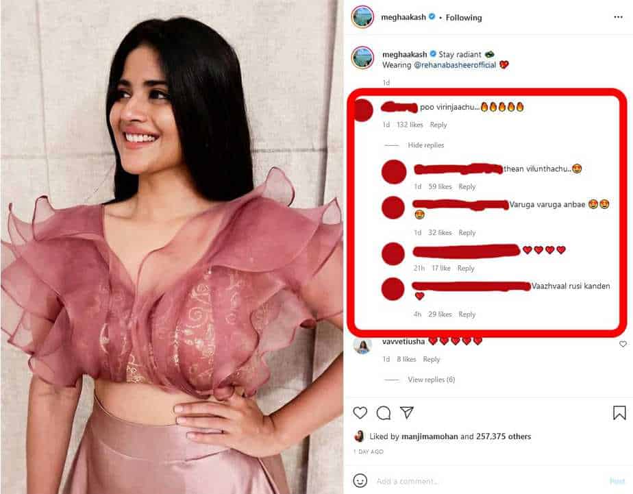 சமூக வலைதளங்களில் ஆக்டிவாக இருக்கும் மேகா ஆகாஷ் இப்பொழுது பூ பூத்தது போல இருக்கும் கவர்ச்சியான உடையில் சில புகைப்படங்களை வெளியிட்டுள்ளார். இதனை பார்த்த ரசிகர்கள், பூ விரிஞ்சாச்சு.. என்று முகவரி பட பாடலை கமெண்ட் செய்து வர்ணித்து வருகின்றனர்